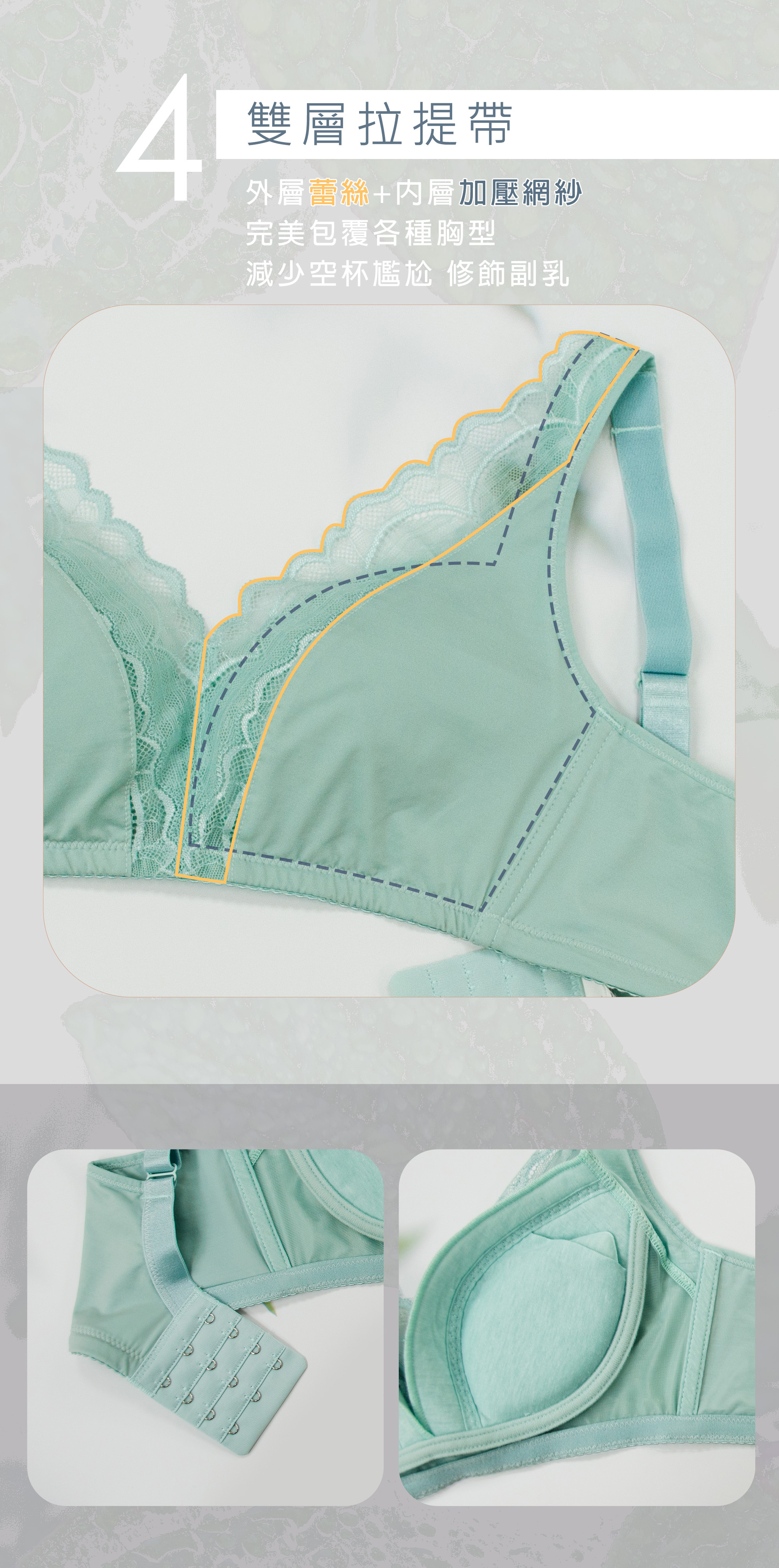 款式:無鋼圈、3/4杯型、可調式肩帶、肩帶不可拆、四排三鉤背扣
