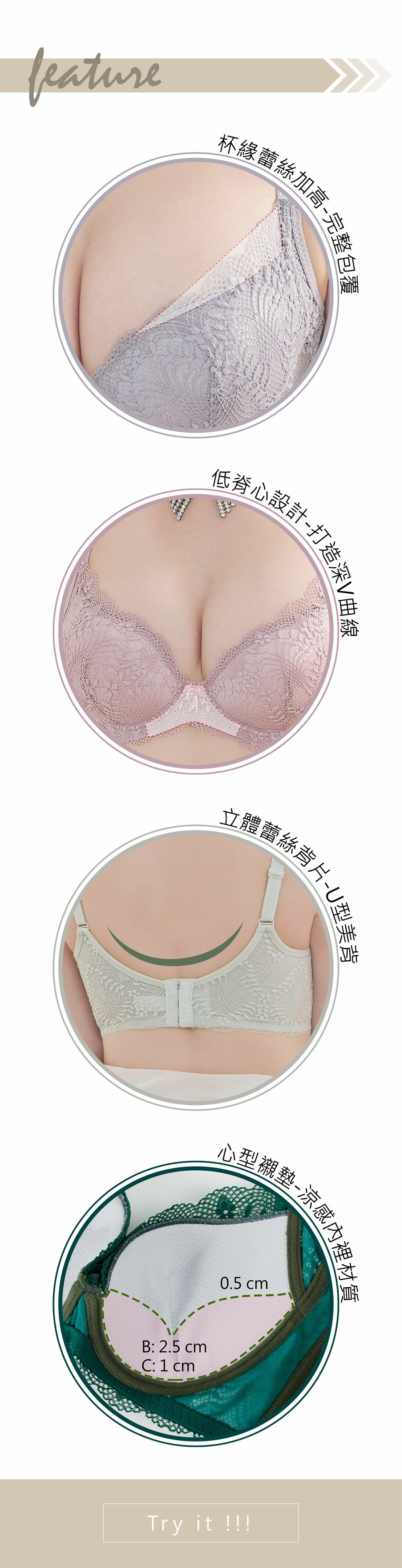 .愛心型襯墊,集中托高、完美包覆感