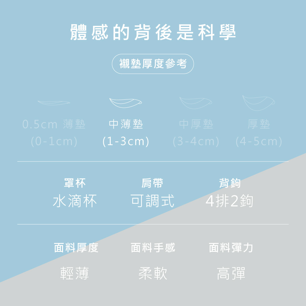 款式:3/4水滴杯、無鋼圈、固定式襯墊(下薄上厚)、肩帶不可拆、可調式肩帶、4排2鉤