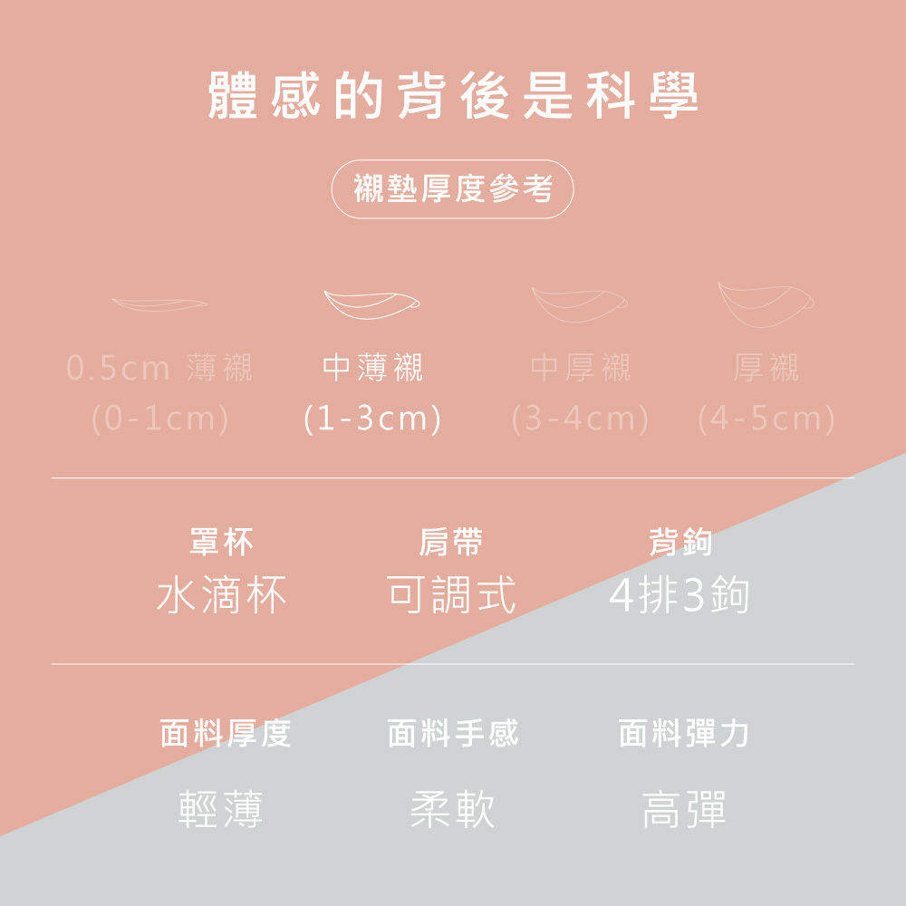 款式:3/4水滴杯、無鋼圈、固定式襯墊(下厚上薄約2cm)、肩帶不可拆、可調式加寬肩帶、4排3鉤