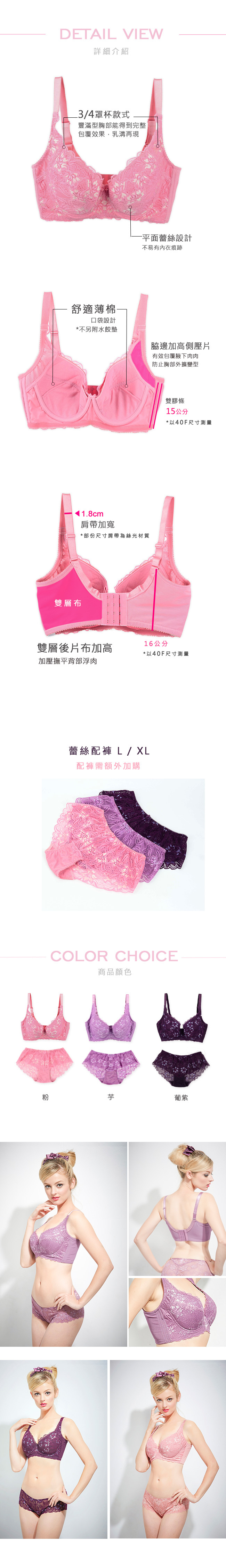 款式:3/4罩杯、三排四鉤、可調式肩帶、口袋設計(無水餃墊)、側壓雙膠條、肩帶加寬1.8cm、雙層後片布加高