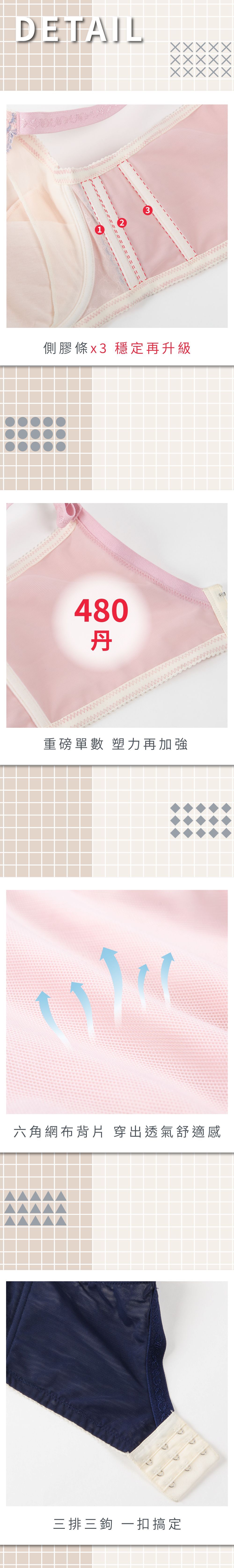 .側邊三膠條側壓包覆 穩固胸型