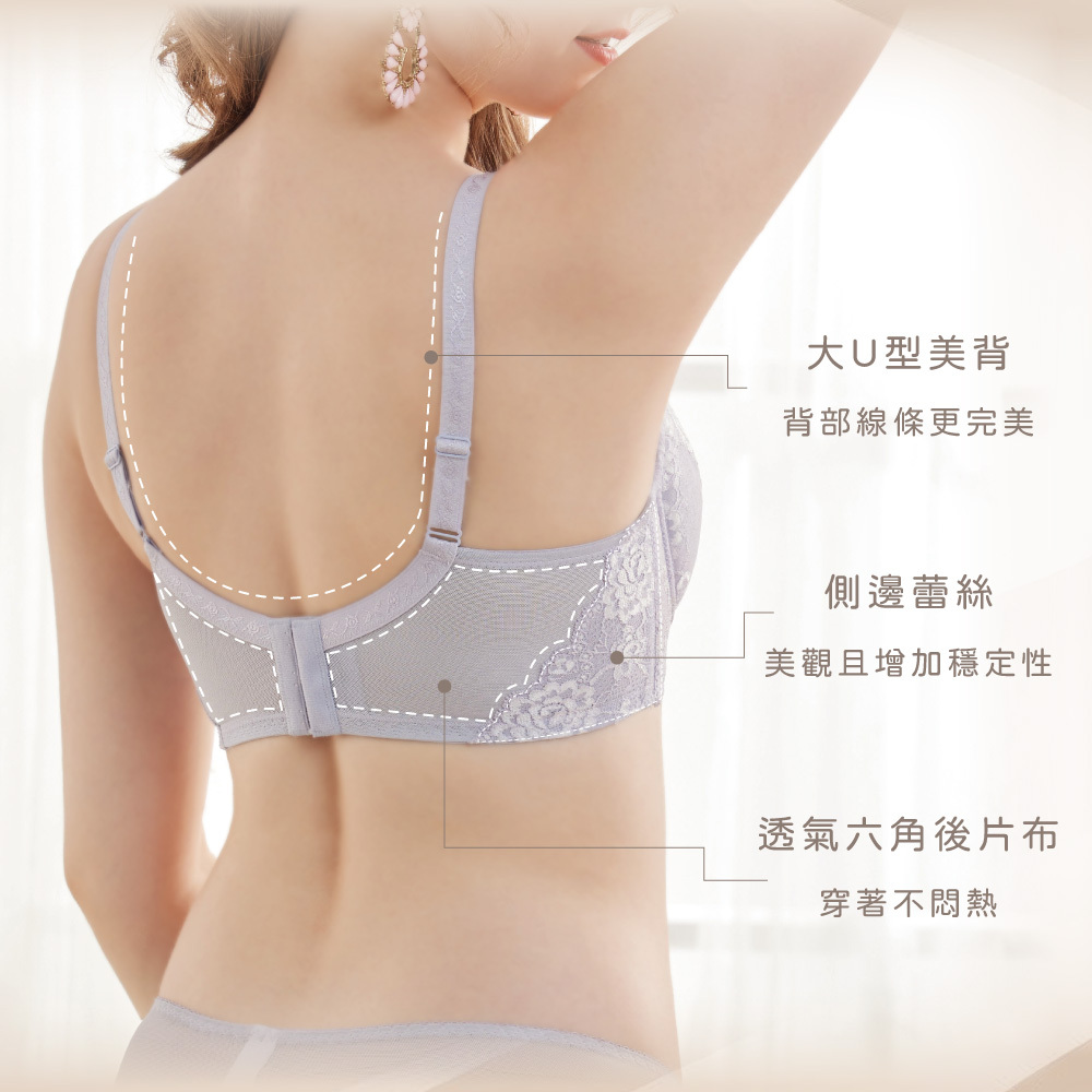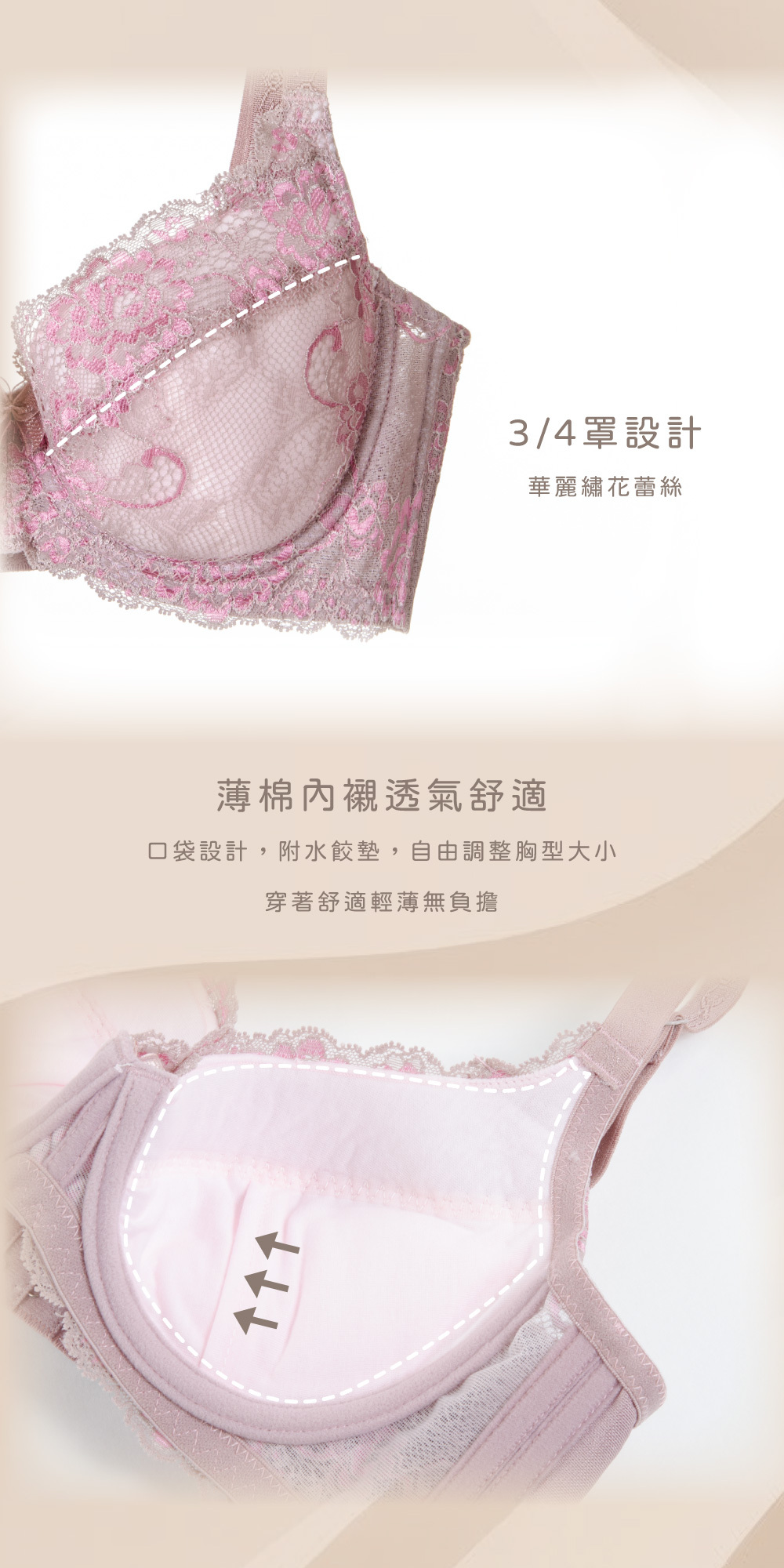 款式:3/4杯型、有鋼圈、薄棉罩杯附水餃墊、可調式肩帶、肩帶不可拆、雙膠條、3鉤3排背扣