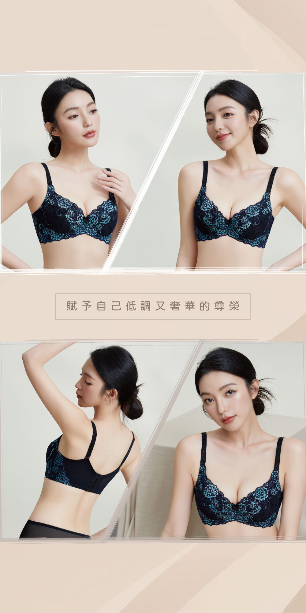 款式:3/4杯型、有鋼圈、薄棉罩杯附水餃墊、可調式肩帶、肩帶不可拆、雙膠條、3鉤3排背扣