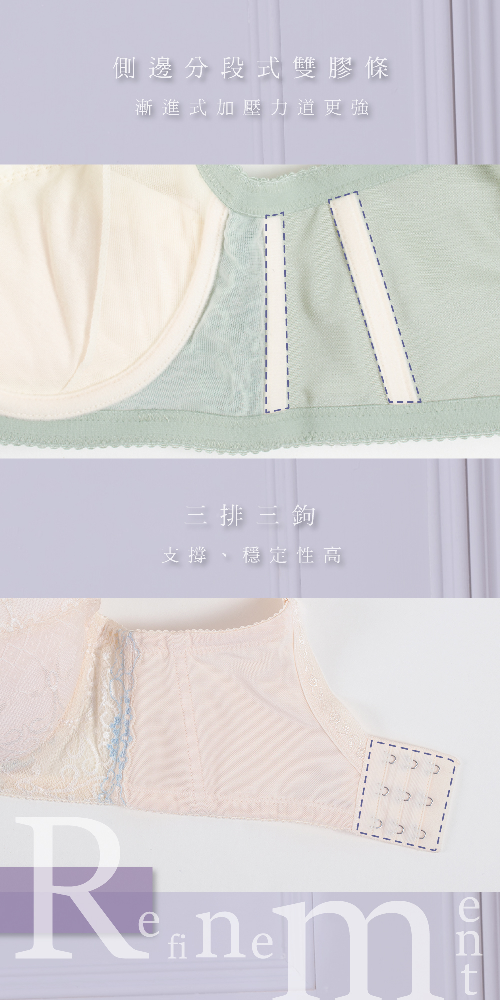 款式:4/5杯型、水滴杯、薄棉內襯(附可拆襯墊)內月牙提托片、3排3鉤、側邊雙膠條、固定式可調整肩帶