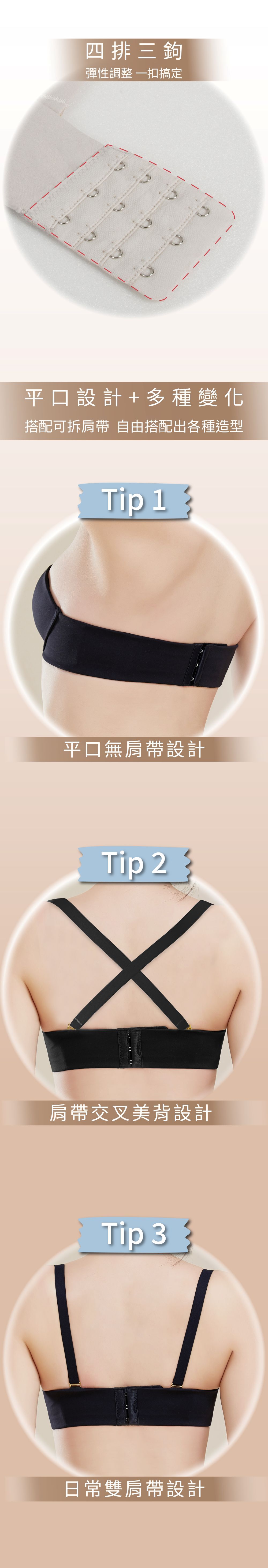 • 分段雙膠條設計 前段固定 後段推提 穩定撐托