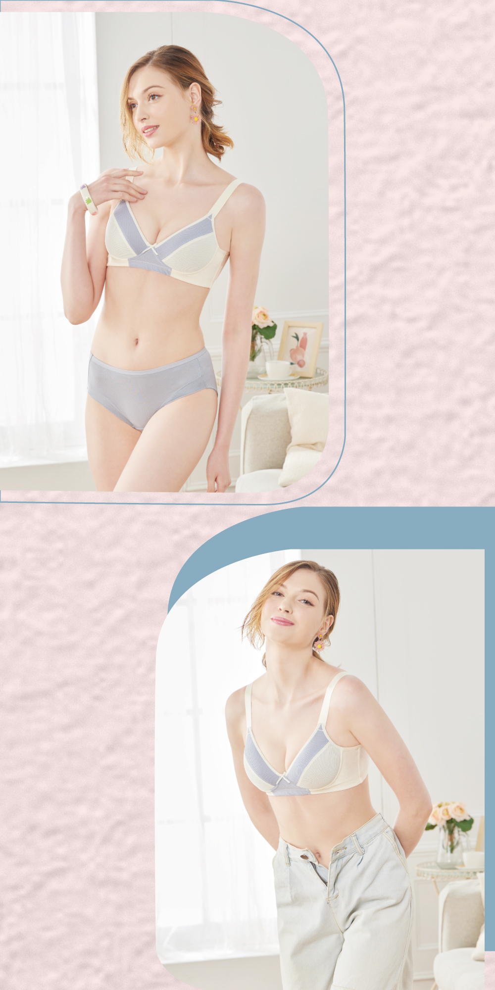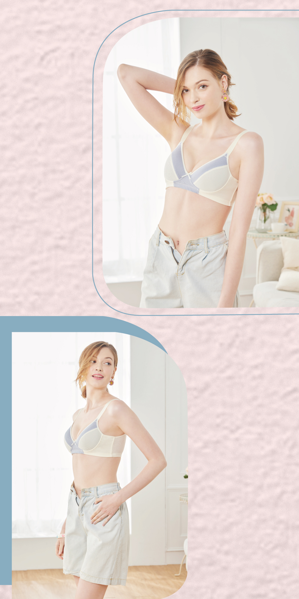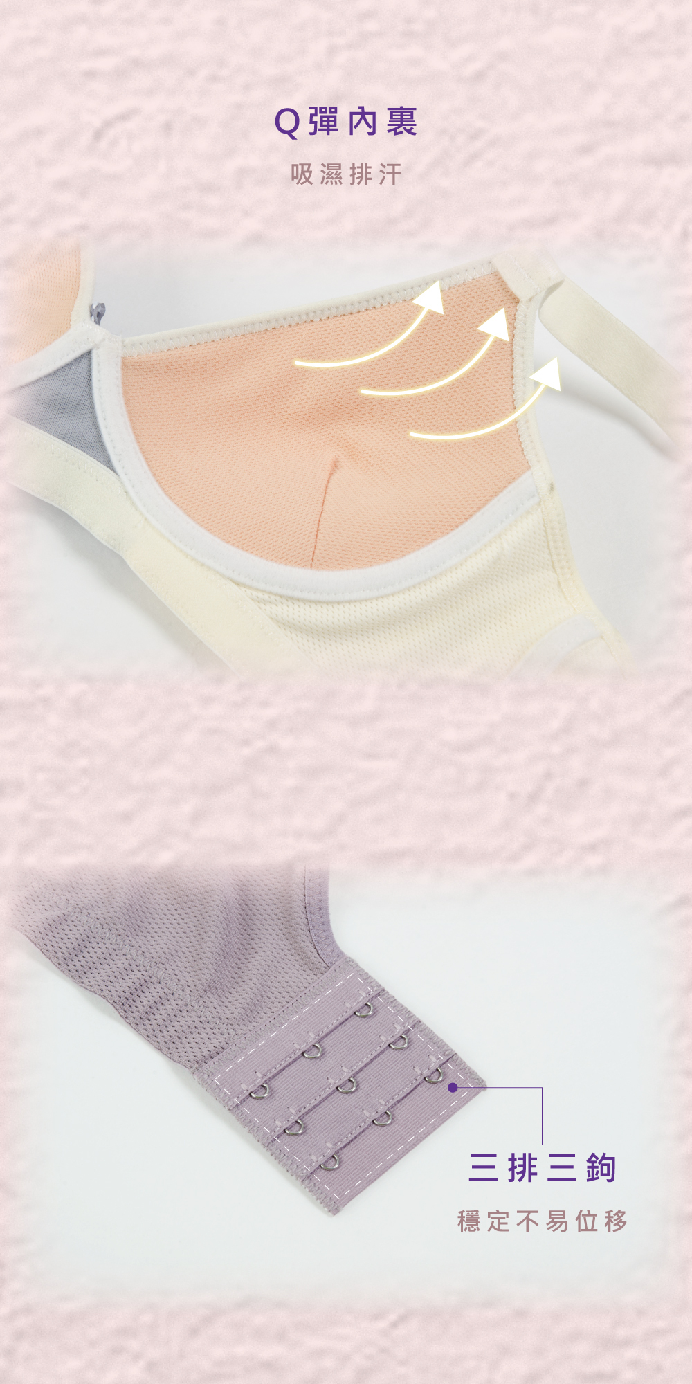 款式:無鋼圈、3/4罩杯、可調式肩帶、三排三鉤、彈力Q棉罩杯、透氣網布、拼接雙色