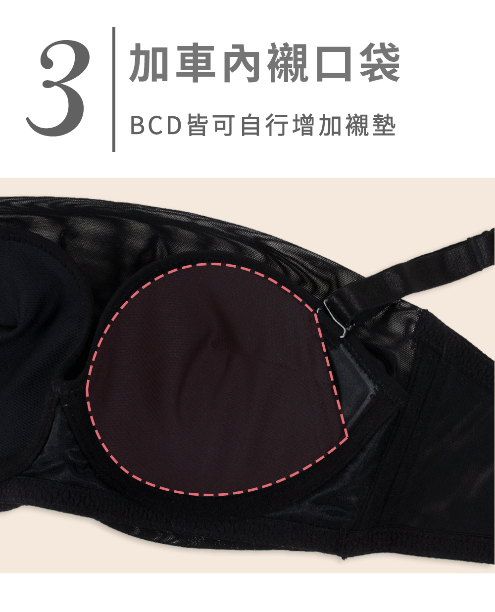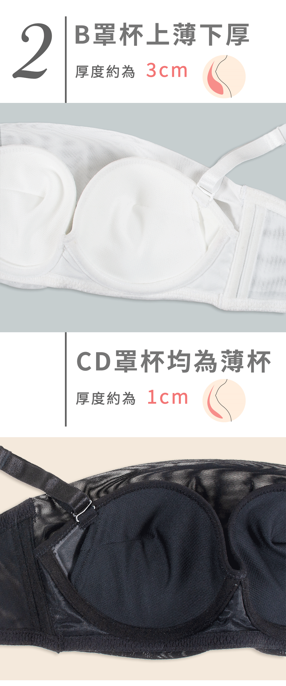 .B罩杯下厚2cm厚墊設計 C.D為均勻薄杯