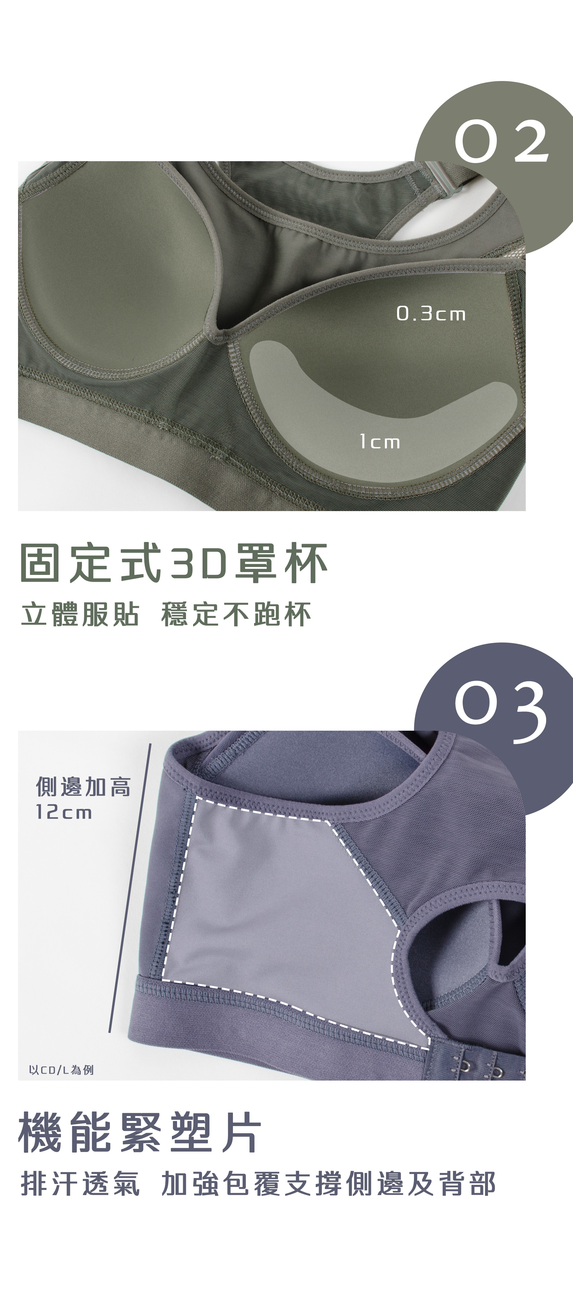 款式:無鋼圈、挖背設計、固定式內裏罩杯、局部彈性肩帶、涼感材質、三排二鉤